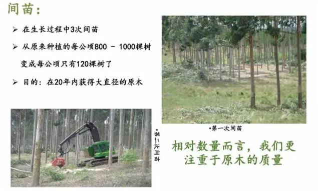 在樹(shù)木生長(zhǎng)的過(guò)程中,通過(guò)間苗的方式將生長(zhǎng)不好的樹(shù)木淘汰掉。使得樹(shù)木最后的質(zhì)量更好,開(kāi)料后的木材等級(jí)也更高。